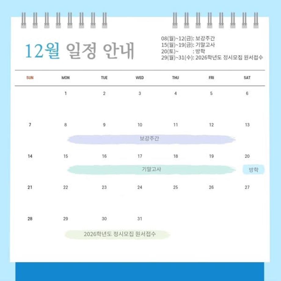 본문 시작 홈으로 커뮤니티 학과소개 입학정보 교과과정 커뮤니티 홈페이지가이드 포토갤러리 SNS 소통 공간 포토갤러리 공지사항 동아리 포토갤러리 페이스북 트위터 프린트 12월 다이어리 항공서비스학과 940 2025-12-02 안녕하십니까 세명대학교 항공서비스학과 온라인 홍보국 💙푸르미르💙입니다. 12월에는 기말고사와 2026학년도 정시모집 원서접수가 있습니다! 확인하시고 일정에 착오 없으시길 바라겠습니다 😊 소중한 꿈을 품고 그 누구보다 높이 오를 여러분을 저희 "푸르미르" 가 항상 응원하겠습니다 ✈💙 궁금한 사항이 있으시다면 언제든지 SNS로 연락 주십시오 💬 #세명대학교 #항공서비스학과 #세명대 목록 이전세명대학교 편의시설 안내 다음 말레이시아 비자 발급